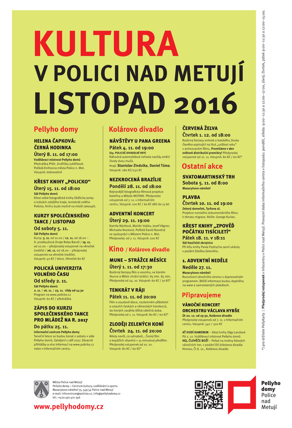 Přehled kulturních a společenských akcí konaných v listopadu v Polici nad Metují najdete na plakátu níže. Srdečně Vás zveme!