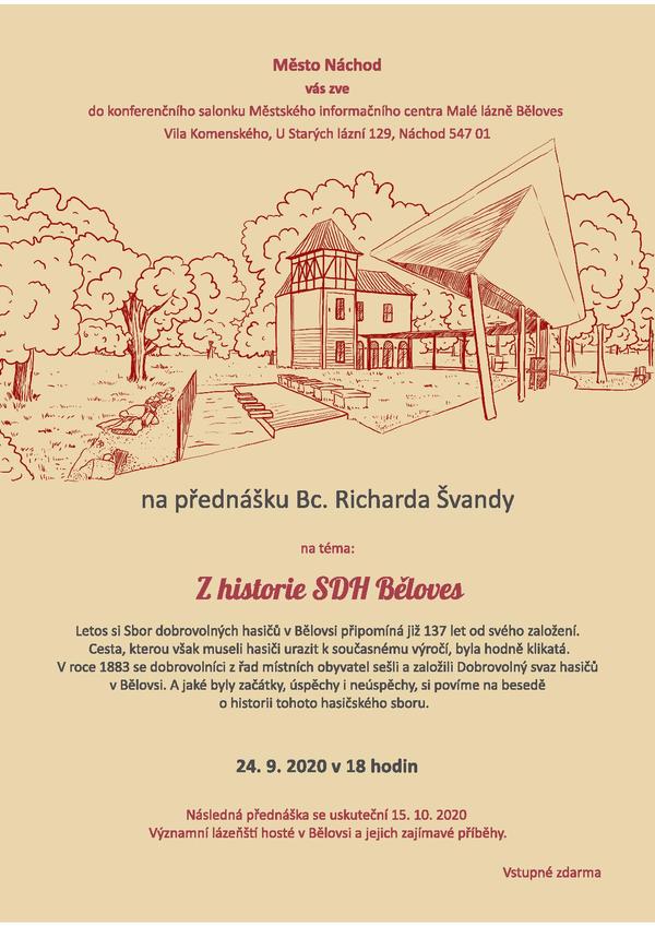 Zveme vás do prostor Městského informačního centra v Malých lázních v Bělovsi, kde se ve čtvrtek 24. září 2020 od 18.00 hodin uskuteční přednáška Richarda Švandy na téma: Z historie Sboru dobrovolných hasičů v Bělovsi.