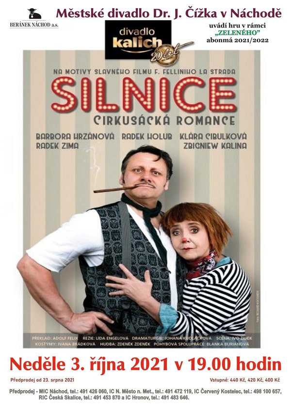 Slavný oscarový film Federica Felliniho Silnice posloužil jako námět divadelní hry, která sděluje prosté a moudré poselství: Každý kámen na světě má smysl. Stejně tak každý člověk, i ten nejubožejší. Také soužití dvojice potulných komediantů, propastně odlišných, má tajemný důvod. Cituplná nota je v pravou chvíli přehlušována veselým rámusem jejich vystoupení. Strhující atmosféra starého cirkusu dokazuje známou pravdu: K tomu, aby umělec diváky pobavil, nepotřebuje technické zázraky, ale spíš pohotovost, vtip a odvahu. Divadelní verze: Lída Engelová, Johana Kudláčková Dramaturgie: Johana Kudláčková Scéna: Ivo Žídek Kostýmy: Ivana Brádková Hudba: Zdeněk Zdeněk Pohybová spolupráce: Blanka Burianová