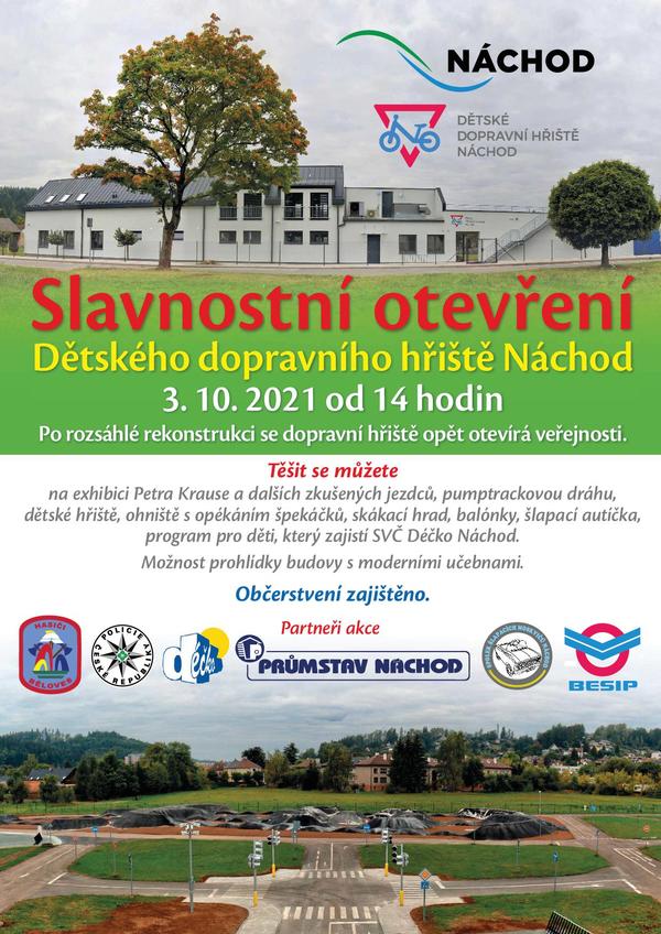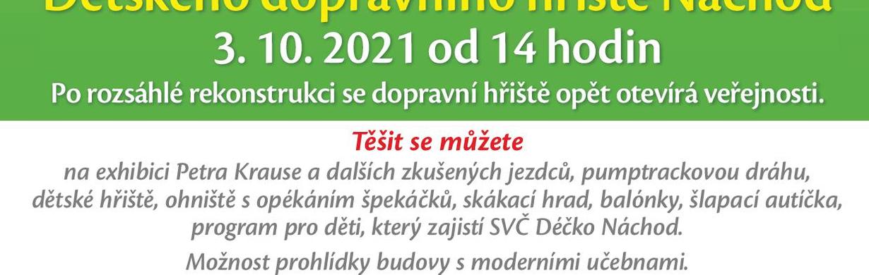 Město Náchod vás zve v neděli 3. října 2021 od 14 hodin na slavnostní otevření Dětského dopravního hřiště v Náchodě-Bělovsi, které se po rozsáhlé rekonstrukci opět otevírá veřejnosti.