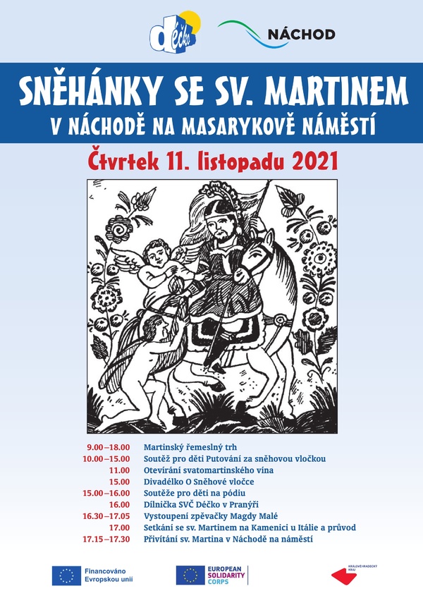 Město Náchod a SVČ Déčko vás zvou ve čtvrtek 11. listopadu 2021 od 9:00 do 18:00 hodin na akci Sněhánky se sv. Martinem, která se uskuteční na Masarykově náměstí.