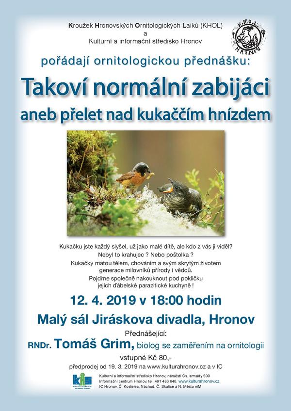 Ornitologickou přednášku pořádá kroužek Hronovských Ornitologických Laiků.
