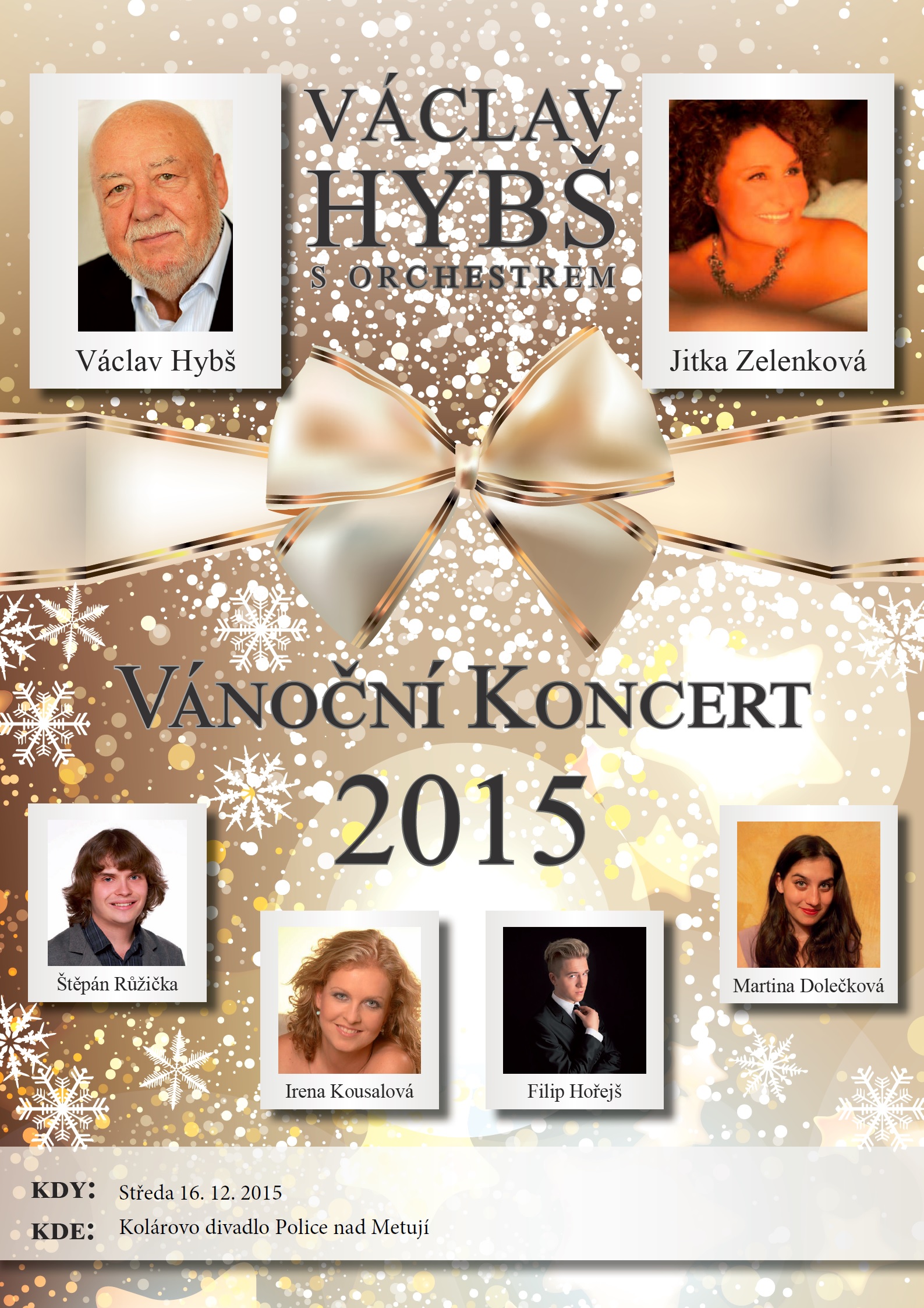 Město Police nad Metují si Vás dovoluje pozvat na Vánoční koncert Václava Hybše a jeho hostů - Jitku Zelenkovou, Štěpána Růžičku, Irenu Kousalovou, Filipa Hořejše a Martinu Dolečkovou. Předprodej vstupenek bude zahájen 18.11.2015 v polickém informačním centru. Začátek představení je v 19:30 hodin v Kolárově divadle v Polici nad Metují. Vstupné 280 kč, 260 Kč. Plakát najdete v příloze.