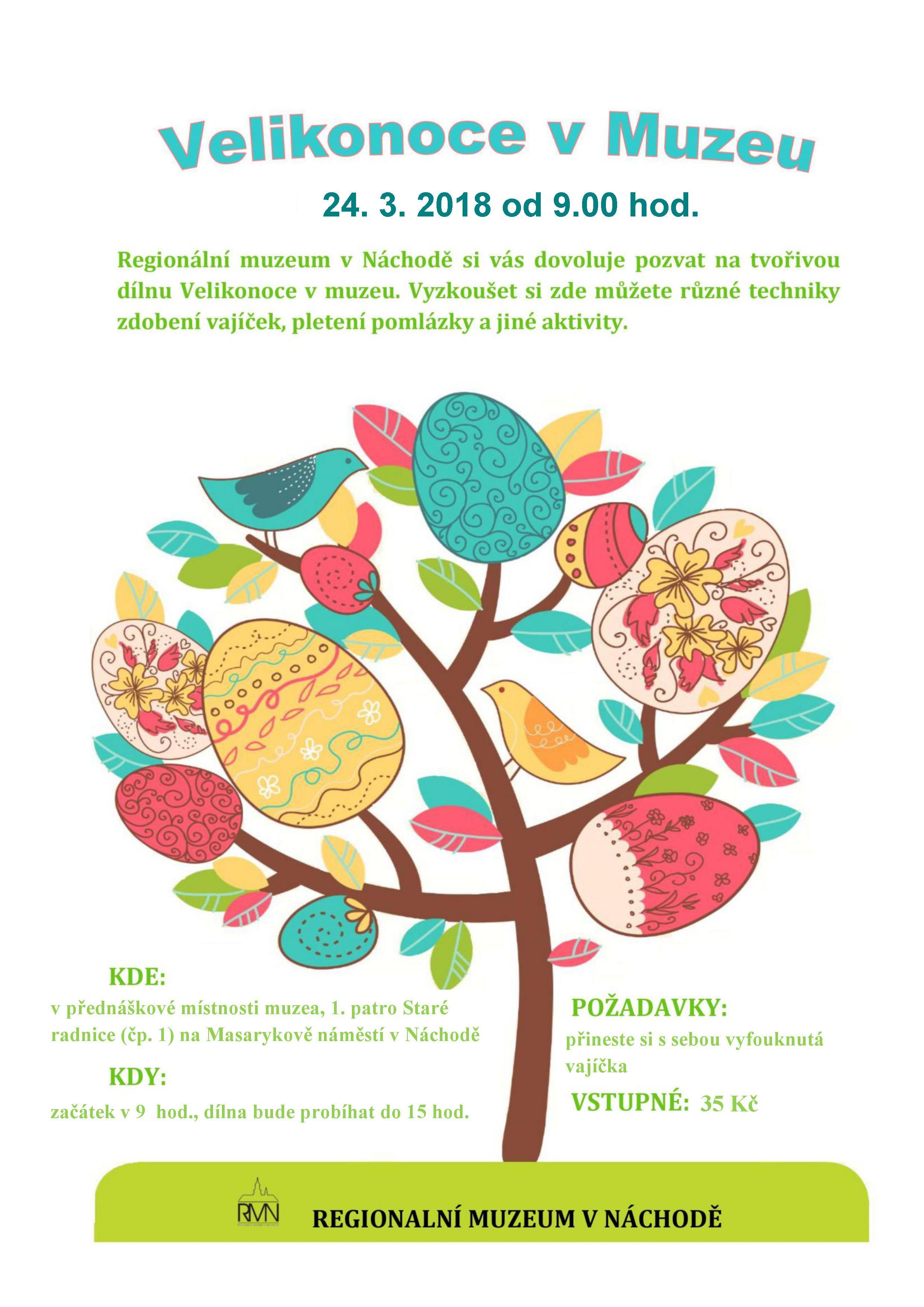 Regionální muzeum v Náchodě si vás dovoluje pozvat na tvořivou dílnu Velikonoce v muzeu. Vyzkoušet si můžete různé techniky zdobení vajíček, pletení pomlázky a jiné aktivity.