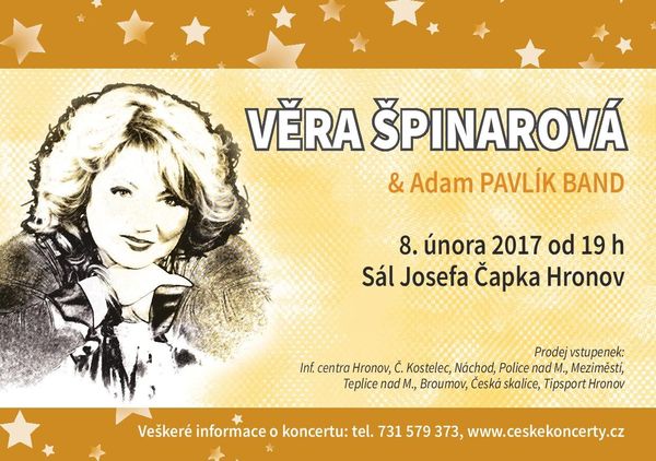 Věra Špinarová - koncert 08. 02. 2017 - 08. 02. 2017 Bližší informace:pořadatel: Michal Lokvenc, tel.: 731 579 373 VYPRODÁNO