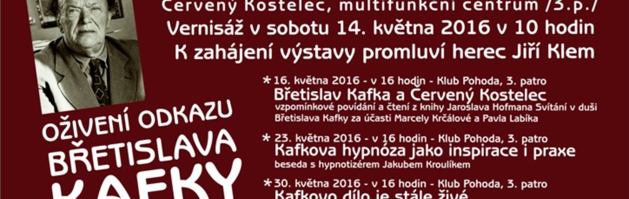 Expozice Oživení odkazu Břetislava Kafky u příležitosti 125. výročí jeho narození bude zahájena v multifunkčním centru ve 3. poschodí knihovny za účasti zástupců města Červený Kostelec, rodiny B. Kafky, jeho příznivců a pamětníků. Na zahájení výstavy promluví herec Jiří Klem. Výstava potrvá do konce měsíce května a v jejím rámci proběhnou další vzpomínkové programy. Pro veřejnost bude výstava otevřená ve všední dny od 9 do 12 a od 14 do 17 hod., v sobotu o 9 do 11 hod. a v neděli od 14 do 16 hod.