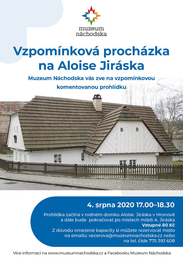 V úterý 4. srpna se můžete od 17.00 zúčastnit speciální vzpomínkové prohlídky Jiráskova rodného domku v Hronově a komentované procházky po místech jeho mládí. Vstupné na celou akci činí 80 Kč a vzhledem k omezené kapacitě prosíme o rezervaci míst předem na e-mailu vecerova@muzeumnachodska.cz nebo tel. č. 775 393 608.