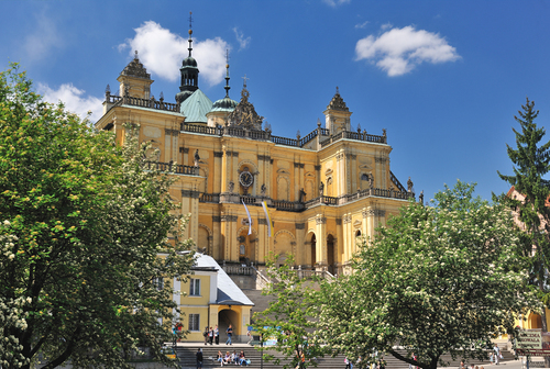 Barokní bazilika Navštívení P. Marie z let 1715–17 byla postavena ve slohu italského baroka, s bohatě zdobeným průčelím a vstupem po monumentálním schodišti. Interiér má bohatou barokní malířskou a sochařskou výzdobu, nejcennějším dílem je gotická soška P. Marie s děťátkem. V obci i okolí jsou četné kapličky a zastavení Kalvárie. Další zajímavostí v obci je pohyblivý betlém (Szopka ruchoma) od L. Wittiga z roku 1882, který čítá přibližně 800 figurek - z toho je 300 pohyblivých.