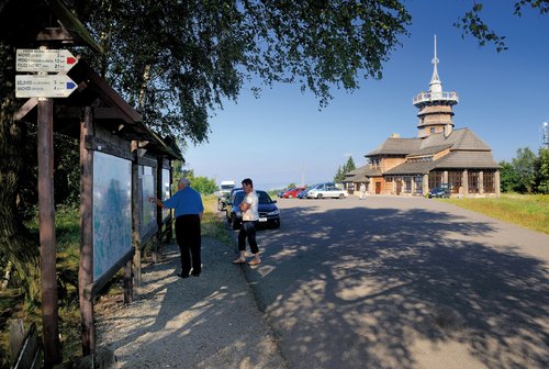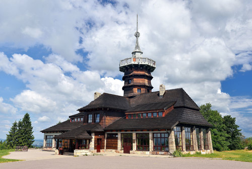 Vyhlídková plošina Jiráskovy chaty ve výšce 15 m nabízí výhled do Čech i sousedního Polska.