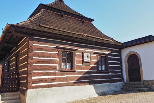 romantická dřevěná chaloupka s tradiční šindelovou střechou. Malá